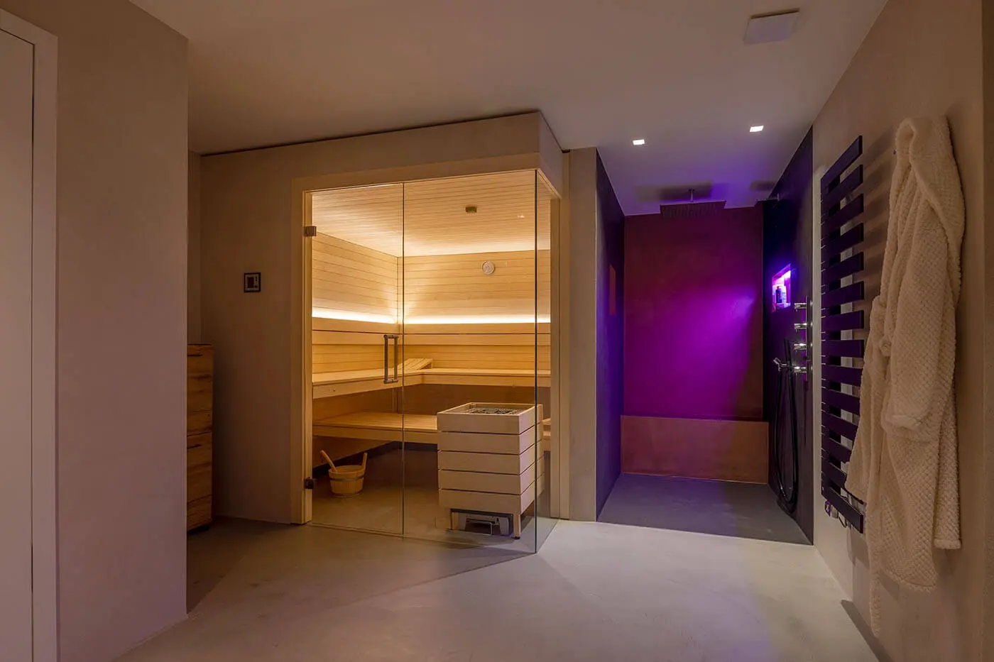 Bei der gemeinsamen Saunaplanung wurde darauf geachtet, die Kabine optimal in den Raum zu integrieren: Laufwege und Blickrichtungen sind so gewählt, dass man sich in der Sauna geborgen fühlt, der Blick beim Saunieren jedoch sowohl ins Grüne als auch in Richtung des Feuers wandern kann. „Durch die offene Gestaltung können wir beim Saunieren den Blick nach draußen in den Garten oder auf das Effektfeuer genießen. Die Sauna ist tatsächlich zu einem Pol der Ruhe für uns geworden, den wir mit der gesamten Familie nutzen. Meine Frau nutzt sie eher als warme Bio-Sauna, doch wenn ich mit meinem Sohn in die Sauna gehe, dann saunieren wir finnisch bei entsprechend hohen Temperaturen. Durch den Kombiofen haben wir alle Optionen.“