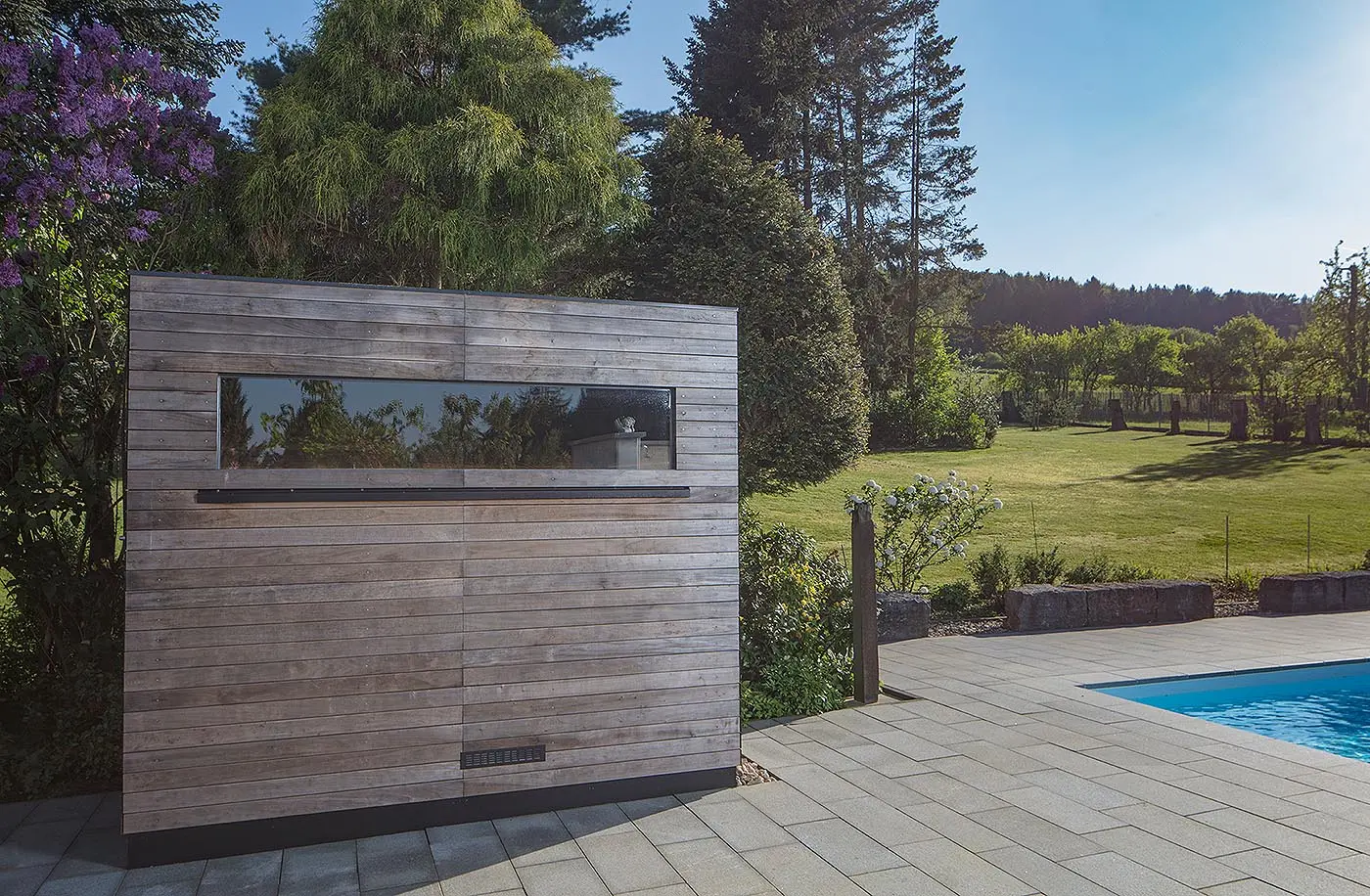 Diese corso Außensauna fügt sich zurückhaltend in die Garten- und Pool-Landschaft ein – und bietet jederzeit gut sichtgeschützte Entspannung. Die Rhombusleisten der Außenverkleidung unterstreichen den schlicht-eleganten Auftritt der Gartensauna. Die geradlinige Innengestaltung lebt vom Kontrast der hellen Espe zum charakterstarken Altholz, das durch die Hinterbankbeleuchtung in Szene gesetzt wird. Die Saunaliegen ohne Bankblende lassen die Einrichtung luftig wirken. Der Kombi-Saunaofen ermöglicht die Nutzung als finnische Sauna oder milderes Warmluftbad. Praktisch ist die EOS Saunasteuerung im Sauna-Innenraum. Nach dem Saunieren lädt der Pool zur Abkühlung ein…