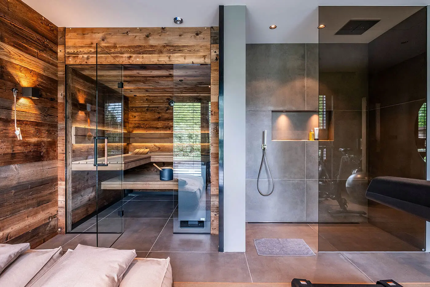 Das Saunahaus wurde nicht nur als Wellness-Rückzugsort konzipiert, sondern als funktional durchdachter Erweiterungsbau. Neben dem Saunaraum selbst bietet es einen großzügigen Vorraum mit integrierter Dusche, WC sowie ausreichend Platz zum Umkleiden – ideal für den Wechsel zwischen Innen- und Außenbereich.