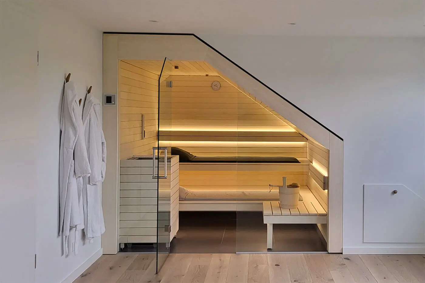 Bei der Planung wurde besonderer Wert auf eine symmetrische Linienführung gelegt. Damit der Design Saunaofen optisch nicht zu stark in den Vordergrund tritt, wurde er passend mit Hemlockholz verkleidet. Als Kombiofen ermöglicht er die Nutzung der Sauna wahlweise als finnische Sauna oder Bio-Sauna (mit niedrigeren Temperaturen und erhöhter Luftfeuchtigkeit).