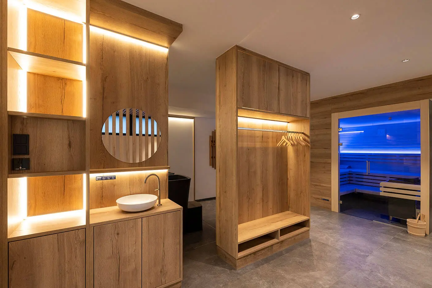 „Das Lichtkonzept ist für uns ein Highlight: die indirekte Beleuchtung des Holzes nach oben und nach unten scheinend, sowohl hinter den Rückenlehnen als auch von der Saunabank nach unten, ist sehr gelungen und rückt das schöne Altholz wunderbar ins rechte Licht – besonders am Abend. Ein weiteres Highlight ist der Blick aus der Sauna in den Lichthof unseres Hauses.“