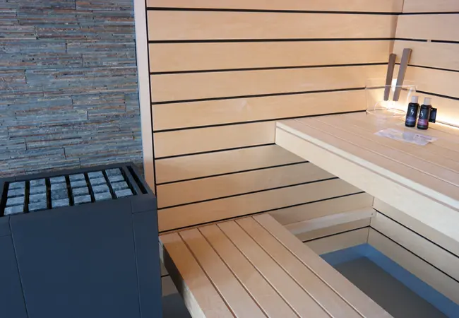 Ce sauna design est particulièrement élaboré avec un profil double-rainure avec languette noir inséré. Le mur derrière le poêle est recouvert de pierre naturelle, les bancs du sauna sont faits en lévitation. Grâce à l’éclairage LED indirect, le sauna est particulièrement bien mis en valeur, la façade en verre confère une légèreté particulière à la cabine.