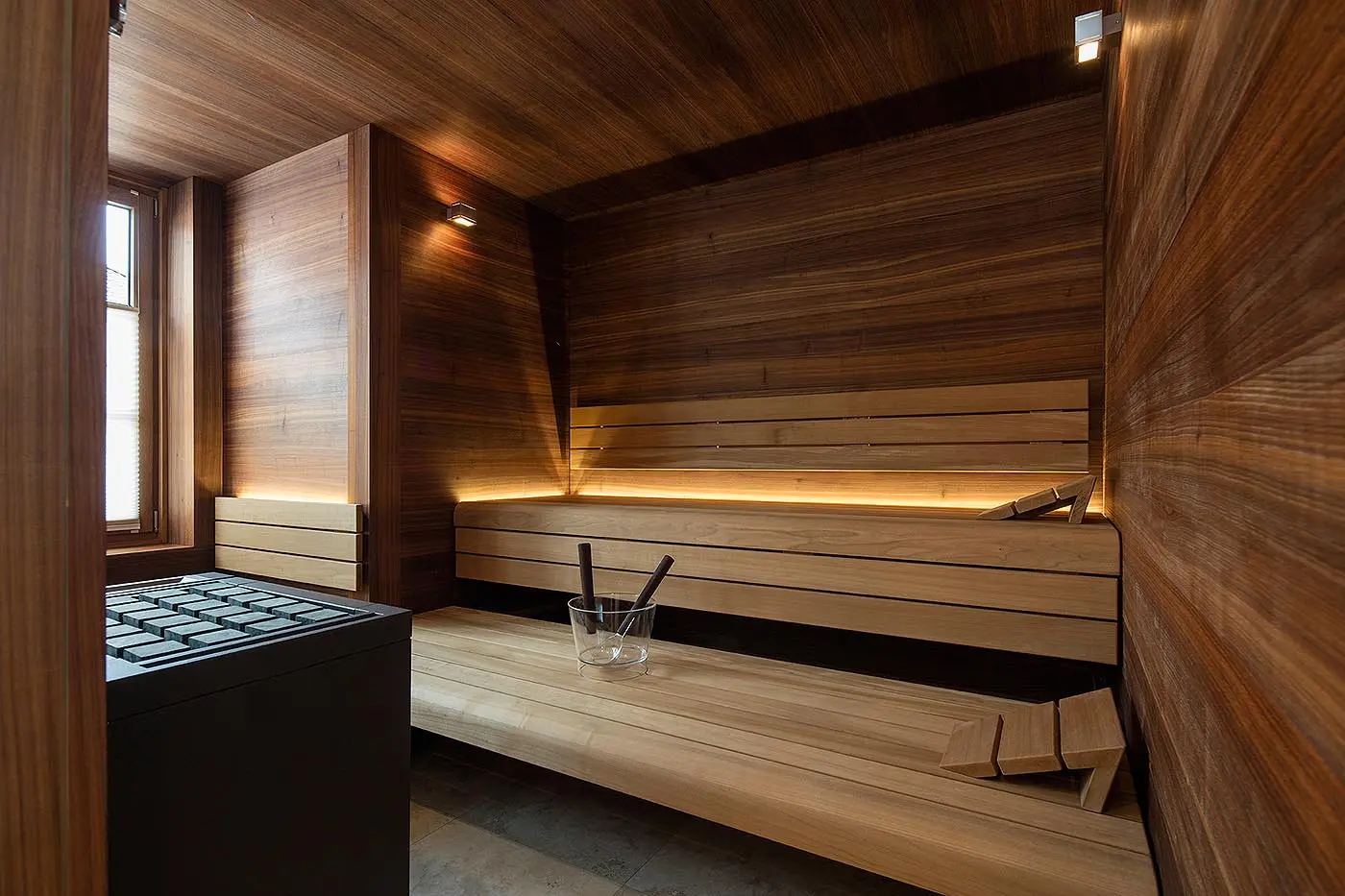 Ce sauna a été intégré dans la salle de bains comme un élément de décoration. Pour le réaliser, il fallait maîtriser des nombreux défis: à commencer par la protection des monuments historiques jusqu’aux emplacements „tortueux“ de la pente du bois. Pour la fenêtre collée, l’élément devait satisfaire aux exigences de protection des monuments historiques, alors que de l’intérieur, le bois devait être non traité. Le design a été mis en oeuvre avec le choix en bois de noyer et pour les bancs en thermo-tremble de grand qualité. Ces bancs seront indirectement éclairés par des LED. Dans l’ensemble, la salle de bains spacieuse offre une vision cohérente avec la baignoire positionnéee directement devant le sauna.