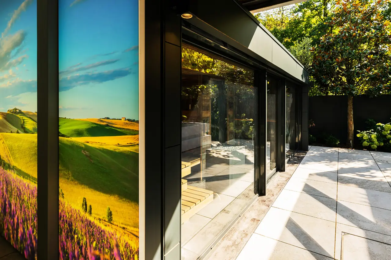 „Anfangs haben wir sie teilweise dreimal wöchentlich genutzt, jetzt nutzen wir sie regelmäßig ein bis zweimal pro Woche. Es ist ein Refugium, über das wir uns jeden Tag freuen, wenn wir rausschauen. Durch die sehr bündige Aufstellung direkt an die Garage haben wir kaum etwas vom Platz im Garten verloren. Auch der Blick von der Terrasse auf das begrünte Dach der Außensauna ist sehr gelungen. Und selbst, wenn wir aus dem Gästezimmer schauen, gibt es einen gelungenen Ausblick – auf das beleuchtete Bild der Toskana-Landschaft an der Seite der Sauna.“