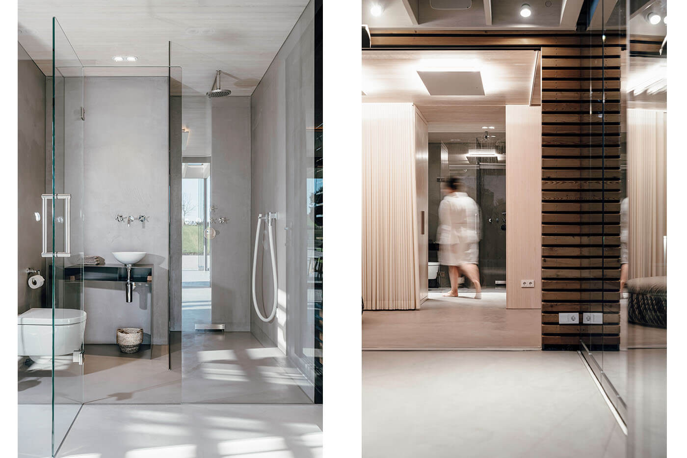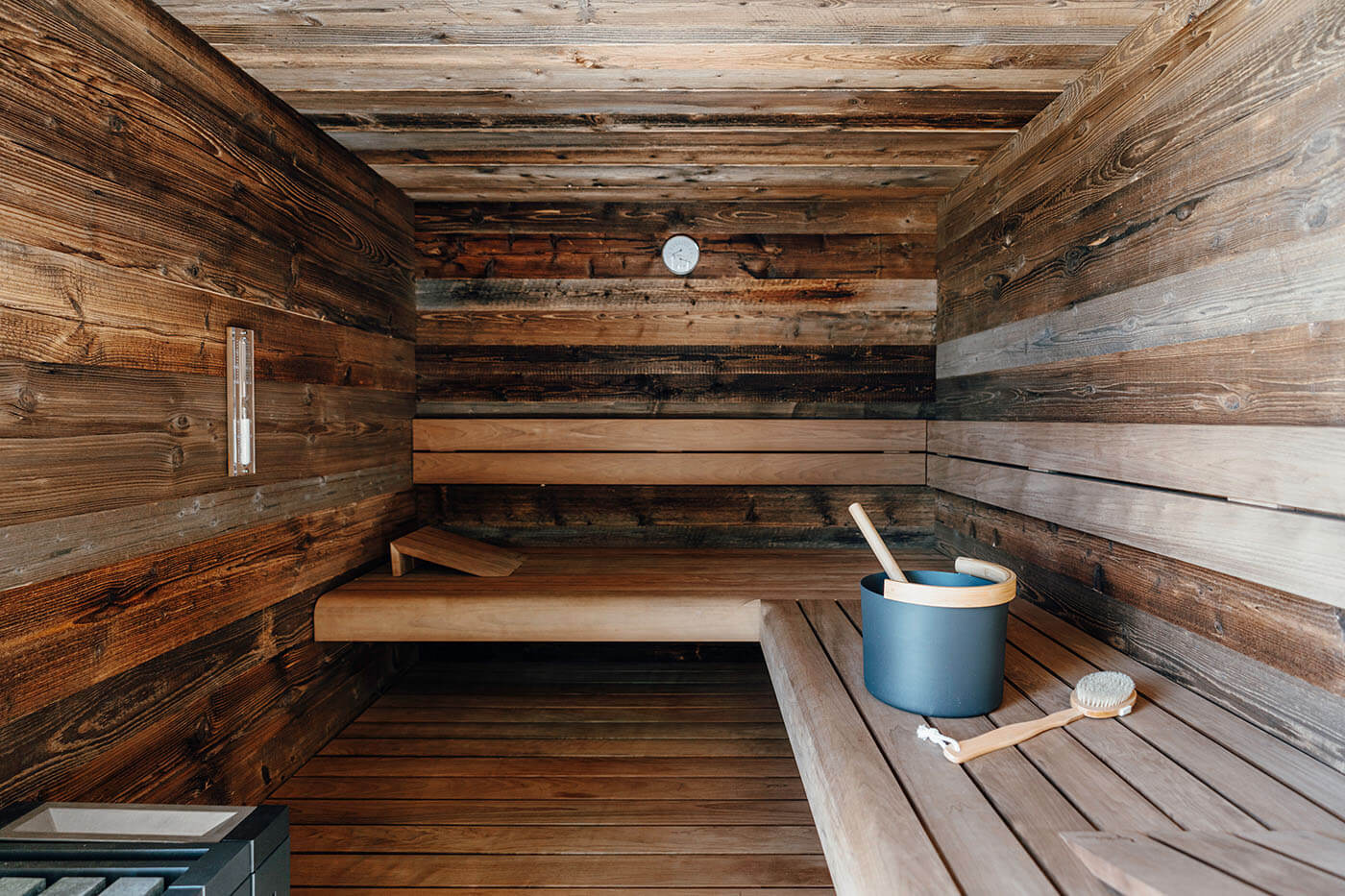 Geschützte Bereiche wie die finnische Sauna, die Infrarotkabine, Umkleide, Dusche, WC und die Technik sind in einer Hülle aus rustikaler Lärchenholzverschalung verborgen. Die im Laufe der Zeit bewusst eine natürliche Patina entwickeln darf. Herzstück der Anlage ist die Sauna aus charakterstarkem original Altholz, die eine Atmosphäre wie in einer gemütlichen Berghütte vermittelt.