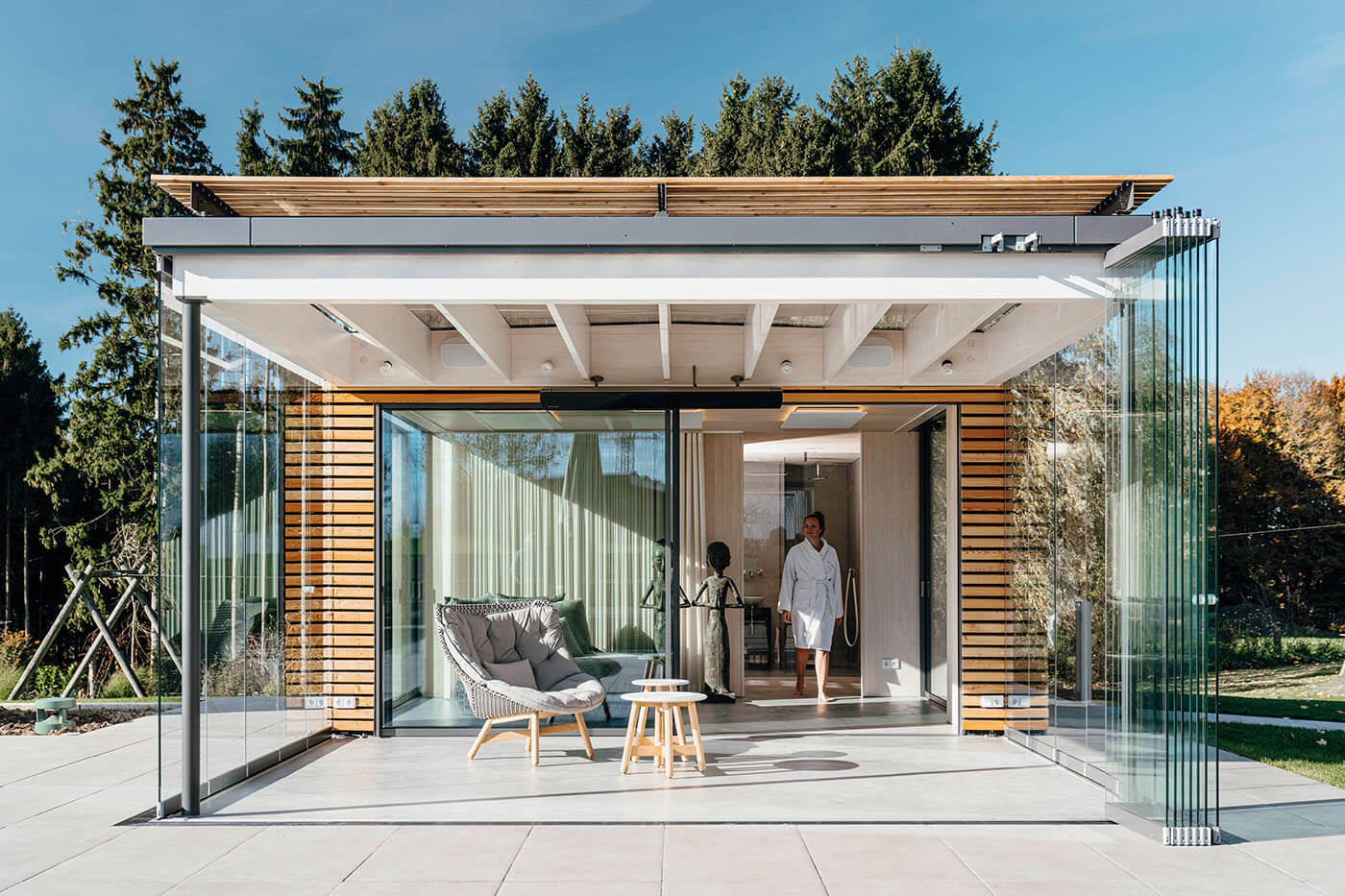 Das vorgelagerte Glashaus lässt sich ebenfalls komplett zur Umgebung öffnen: Seitenelemente können aufgefaltet oder verschoben werden, sodass ein fließender Übergang von drinnen nach draußen entsteht. Ermöglicht wird dies durch ein Schiebe-Dreh-System in Kombination mit einer raumhohen Glas-Faltwand – für ein einzigartiges Natur- und Wohlfühlerlebnis.
