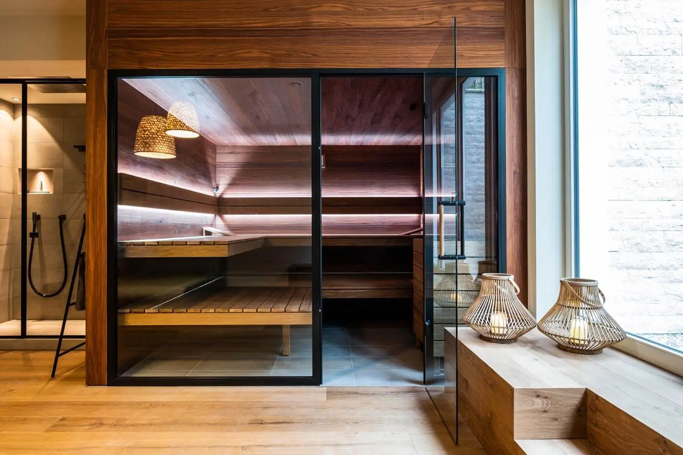 Im Souterrain eines Neubaus Nahe München hat sich eine Familie ihren Wellnesstraum erfüllt und dieses stilsichere Privat SPA bauen lassen. Dank der warmen Atmosphäre und hochwertiger Materialien ein perfekter Raum, um sich wohl zu fühlen und zu entspannen. Neben der Sauna aus Nussbaum ist eine eigene Salzgrotte mit hinterleuchteten Himalaya-Salzsteinen das Highlight. Mit dem durchdachten Beleuchtungskonzept können die Lichtfarben der Stimmung angepasst werden. Der Bauherr zum Projekt: „In erster Linie…